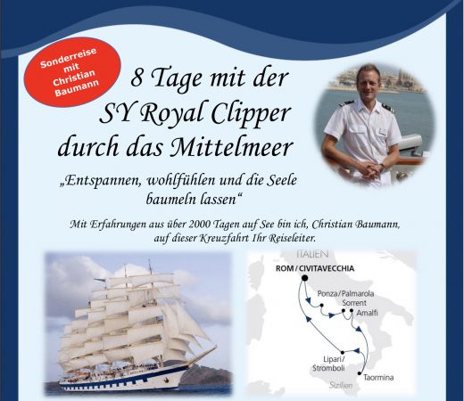 Ahoi! Am Samstag geht es los. Wir freuen uns auf eine aufregende, erlebnisreiche 7 Tage- Reise mit der Royal Clipper, einem der größten Segelschiffe der Welt. Von Rom nach Rom, über Ponza, Sorrent, Amalfi,...