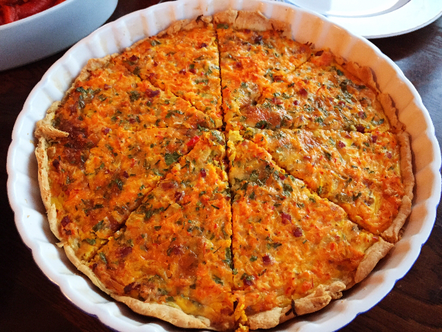 Zutaten für eine Tarteform 26 cm: 400 g Kürbis (Hokkaido), geraspelte Menge (!) 2 Zwiebeln 100 g Speck 1 Chilischote 120 g geriebener Emmentaler oder Parmesan 250 g Crème fraîche 3 Eier Salz Pfeffer...