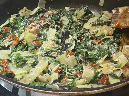 Zutaten für 2 Personen: 400 g Mangold 1 Schalotte 30 g getrocknete Tomaten 🍅 Olivenöl 1 Knoblauchzehe 1/2 Chili 🌶 1 El Creme fraiche Salz Pfeffer Muskat Zubereitung: Mangold putzen, den Stielansatz abschneiden. Stiele...