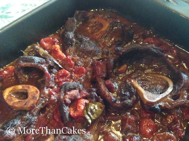 Zutaten für 4 Personen: 4 Kalbshaxenscheiben à 250 g Mehl 2 Stangensellerie 2 Karotten 2 Zwiebel 5 Knoblauchzehen 1 El Tomatenmark 2 Dosen gehackte Tomaten, je 400 ml Butter Olivenöl 2 Gläser Weiß- oder...
