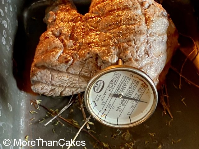 Fleisch waschen und trocken tupfen. Olivenöl in einer beschichteten Pfanne erhitzen. Fleisch darin rundherum 3–4 Minuten anbraten. Mit Salz und Pfeffer würzen, auf ein Backblech geben, mit Bratsatz übergießen und im vorgeheizten Backofen (Umluft: 150 Grad) ca. 20 Minuten medium rare „auf den Punkt“ garen. Die Kerntemperatur sollte 52 Grad betragen. 🥩 aus dem Backofen nehmen, in Alufolie wickeln und 5 Minuten ruhen lassen.