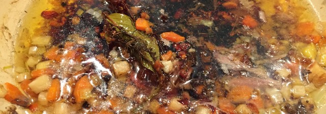 Die feingewürfelten Zwiebel in Gänsefett in einer Pfanne andünsten, gehackten Knoblauch hinzugeben und mit Tomatenmark anrösten. Die Maronen hacken und dazugeben. Die Bohnen in ein Sieb schütten und abbrausen, hinzufügen und so viel Brühe oder Tomatensaft dazugeben, bis alles bedeckt ist. Mit Salz, Pfeffer, Majoran und den Abrieb einer Zitronenschale würzen und fein gehackte Petersilie untermengen. Auf milden Feuer leise köcheln lassen, bis sich alles innig verbunden hat. Erfahrungsgemäß ca. 20-30 Minuten.