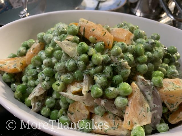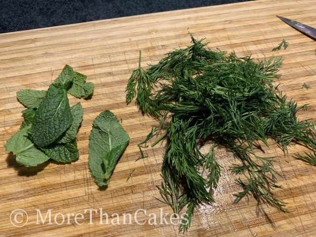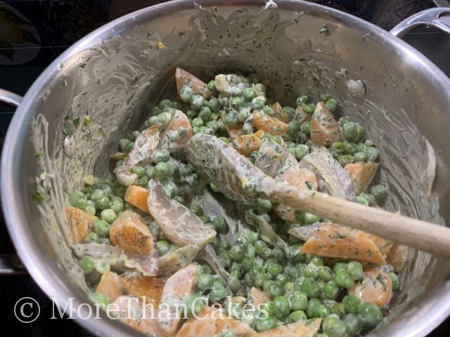 Erbsen und 1 El Wasser zum Gemüse geben und 5 Minuten mitdünsten. Inzwischen Dill und Minze fein hacken. Kräuter und Crème fraîche unter das Gemüse mischen. Mit Salz 🧂 und Pfeffer abschmecken.