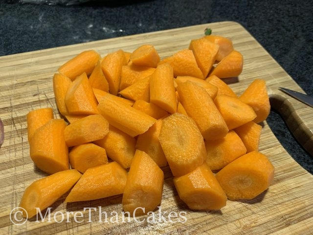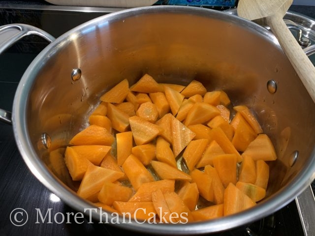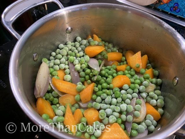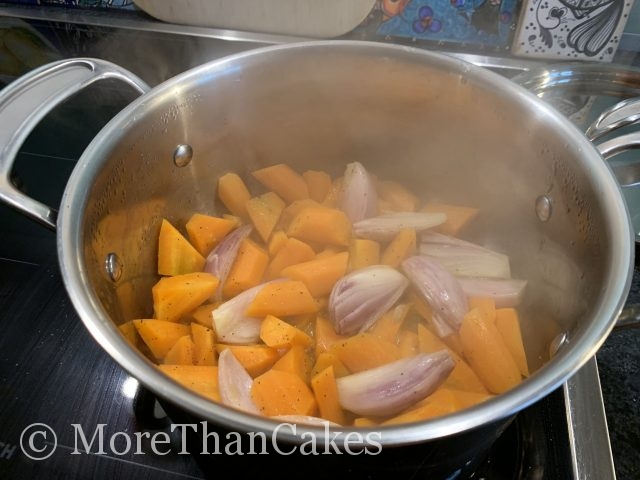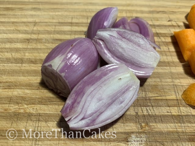 Möhren putzen, schälen und in 3 cm große Stücke schneiden. In einem Topf mit Öl und Butter bei mittlerer Hitze andünsten. Schalotten längs halbieren zugeben, salzen und alles 10–15 Minuten weiterdünsten.