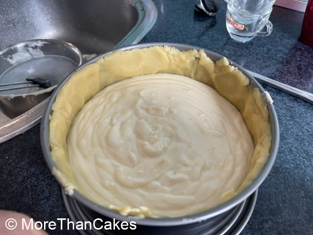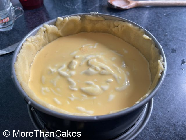Den Teig dünn ausrollen, die ausgebutterte Form damit auslegen. Die Quarkfüllung hineingießen. Das restliche Eigelb mit Milch glatt rühren und mit einem Pinsel auf der Oberfläche verstreichen.