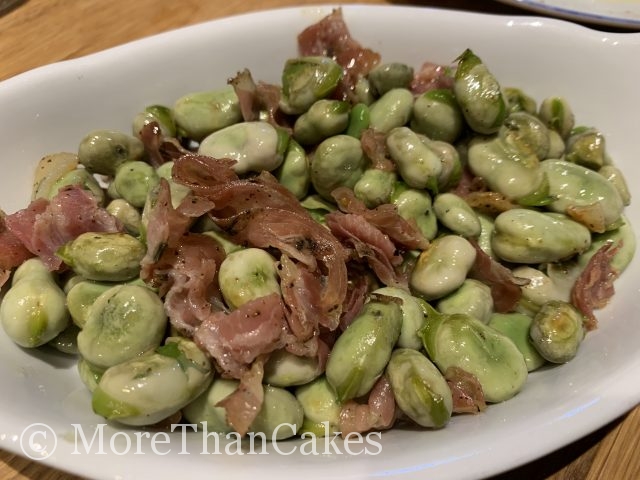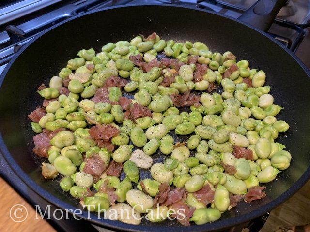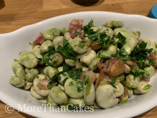 Die Kerne der Saubohnen aus den Hülsen nehmen. Das Öl in einer Pfanne erhitzen, den gehackten Knoblauch und den Pancetta anbraten. Die Bohnen hinzufügen, abdecken und für 10 Minuten köcheln lassen. Mit der Petersilie, Salz und Pfeffer abschmecken und warm servieren.