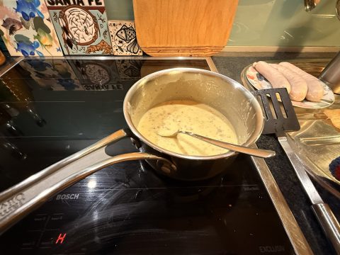 In der Zwischenzeit den Knoblauch fein hacken. Die Sahne in einem Topf erhitzen und groben Senf, Honig, Knoblauch und Zitronensaft hinzufügen. Alles gut miteinander verrühren und die Soße bei mittlerer Hitze so lange köcheln, bis sie leicht eindickt. Mit Salz und Pfeffer abschmecken.