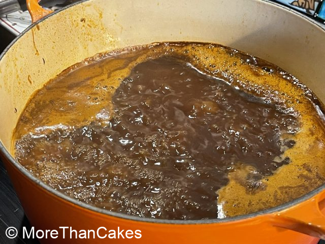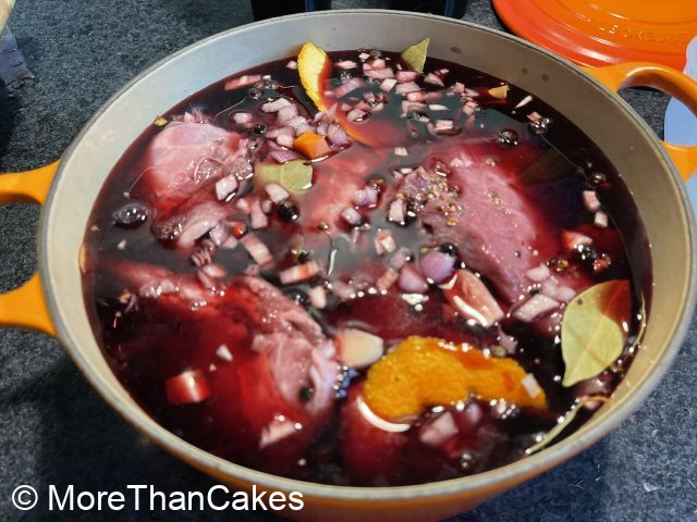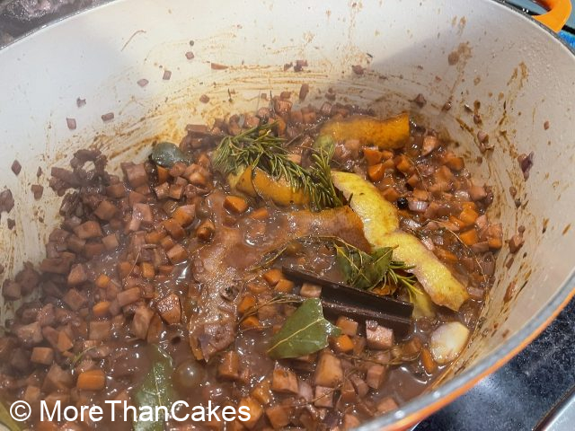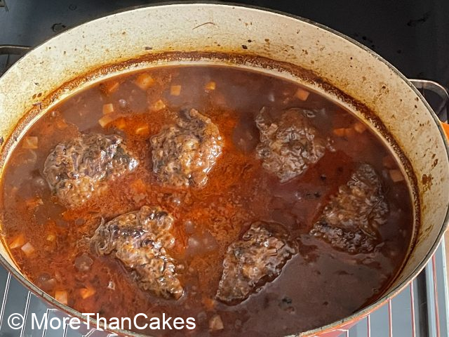 Das abgeseihte Gemüse in den Topf geben (evtl. noch etwas Olivenöl zufügen) und ca. 10 Minuten dunkelbraun rösten. In der Zwischenzeit den Ofen auf 160 Grad Ober-/Unterhitze vorheizen. Tomatenmark zugeben, 30 Sekunden mitrösten. Mit der Marinade ablöschen, stark einkochen. Restliche Marinade, Fond, 400 ml kaltes Wasser und Kalbsbäckchen zugeben. Den Topf zudecken und für 1,5 Stunden in den vorgeheizten Ofen schieben. Die Bäckchen sollten schön zart sein.
