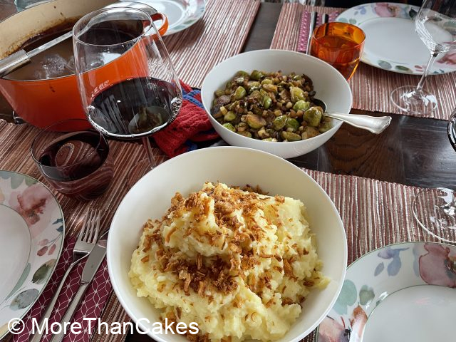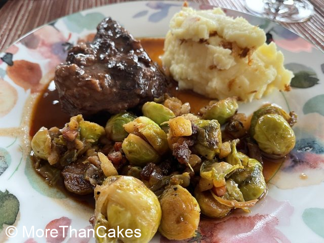 Geschmorte marinierte Kalbsbäckchen mit Kartoffelstampf und gebratenen Rosenkohl