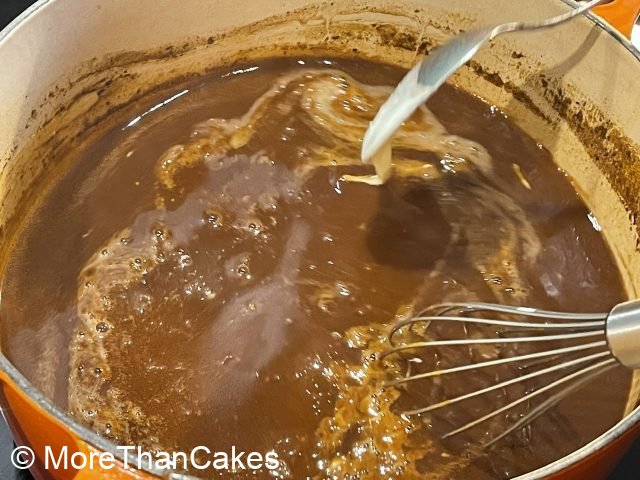Am nächsten Tag Kalbsbäckchen aus der Marinade nehmen und trocken tupfen. Marinade durch ein Sieb gießen, Gemüse und Marinade auffangen. Die Bäckchen leicht mit Salz und Pfeffer würzen und mehlieren. Einen schweren Topf aufsetzen und auf mittlerer Hitze heiß werden lassen. So viel Butterschmalz oder Olivenöl in den Topf geben, bis der Topfboden bedeckt ist. Die Bäckchen von beiden Seiten anbraten, bis sich Röstaromen bilden. Die Kalbsbäckchen herausnehmen und beiseite stellen.