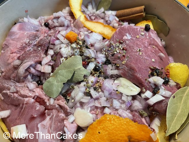 Am Vortag die Kalbsbäckchen von den Sehnen befreien. Wacholderbeeren und Pfeffer in einem Mörser leicht andrücken. Orange und Zitrone heiß abwaschen, Schale ohne die weiße Innenhaut mit dem Sparschäler sehr dünn abschälen. Schalotten fein schneiden. Möhren putzen, schälen und fein würfeln. Sellerie putzen, waschen und fein würfeln. Knoblauch leicht andrücken. Kalbsbäckchen in einer Schüssel mit Wacholder, Pfeffer, Orangen- und Zitronenschale, Zimt, Rosmarin, Thymian, Lorbeerblätter, Schalotten, Möhren und Sellerie bedecken, mit Rotwein auffüllen und abgedeckt über Nacht marinieren.