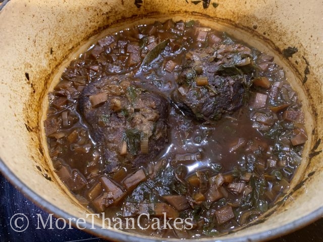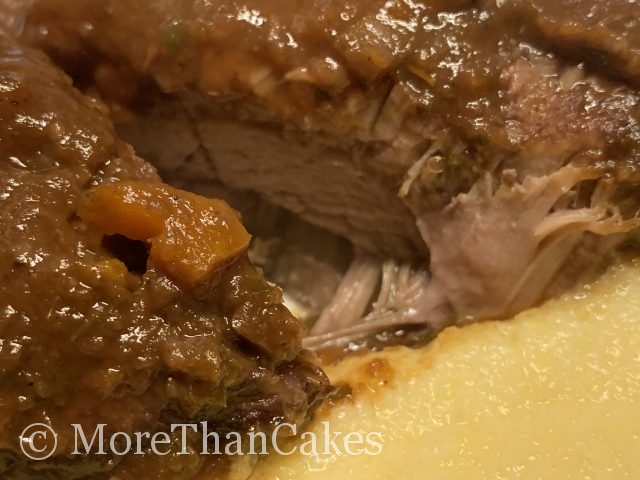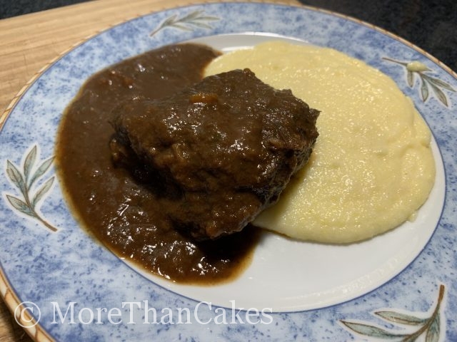 Das Fleisch aus dem Bräter nehmen und warm stellen. Für die Sauce die eingedickte Flüssigkeit mit einem Teil des Gemüses pürieren, um die erforderliche Bindung zu erreichen. ein feines Sieb passieren. Die Kalbsbäckchen mit der Sauce servieren. Dazu passt cremige Polenta.
