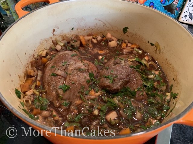 Den Backofen auf 180 Grad (Ober-/Unterhitze) vorheizen. Das Suppengemüse, die Zwiebel und den Knoblauch grob würfeln. Die Kalbsbacken sorgfältig von Haut, Fett und Sehnen befreien. Salzen, pfeffern und leicht mit Mehl bestäuben. Etwas Gänseschmalz in einem Bräter erhitzen. Die Kalbsbacken hineinlegen, von allen Seiten anbraten und herausnehmen. Nochmals Schmalz hinzugeben, die Zwiebel und den Knoblauch anschwitzen. Nun das Gemüse und Tomatenmark dazugeben, salzen, pfeffern und mitrösten. Dann noch etwas Mehl darüberstäuben und leicht anrösten. Mit einem kräftigen Rotwein ablöschen. Thymian und Petersilie dazugeben. Die Kalbsbacken hineinlegen. Diese sollen von der Flüssigkeit gerade nicht bedeckt sein. Falls erforderlich Wasser auffüllen. Im Backofen bei 180 Grad ca. 2 Stunden schmoren. Die Bäckchen nach 60 Minuten wenden und gegebenenfalls Wasser 💦 nachfüllen.