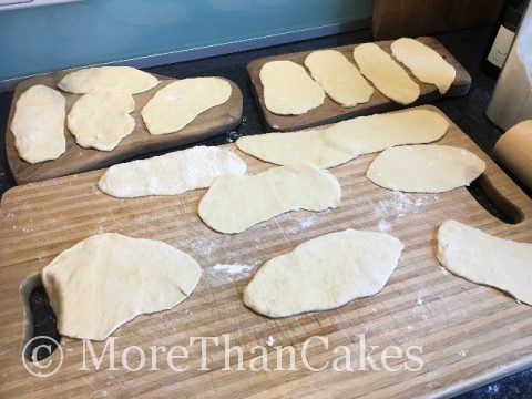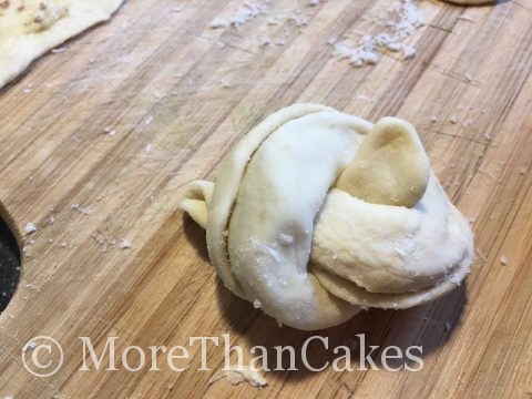 Teig auf einer bemehlten Arbeitsfläche nochmals durchkneten und in 16 gleich große Stücke teilen. Diese wieder abdecken, damit sie nicht austrocknen. Nacheinander in 15 cm lange, ovale Fladen rollen. Je 1 Tl Fenchelbutter und Parmesan darauf verteilen. Fladen jeweils von der Längsseite aufrollen, die Enden miteinander verknoten. Mit Abstand auf ein mit Backpapier belegtes Backblech legen abdecken und nochmals gehen lassen.