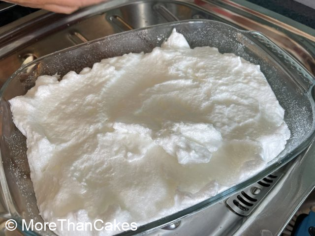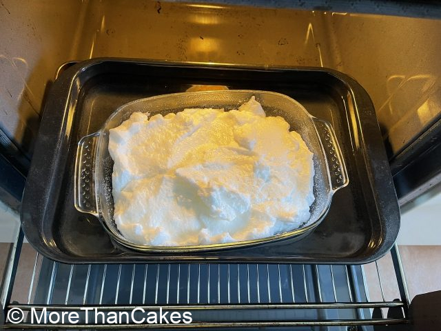 Für den Eischnee eine Auflaufform mit Butter einfetten und leicht mit Zucker ausstreuen. Eiweiße steif schlagen, dabei langsam den Zucker einrieseln lassen. Den Eischnee in die Form füllen und im Wasserbad bei 100 Grad in 10 Minuten fest werden lassen.