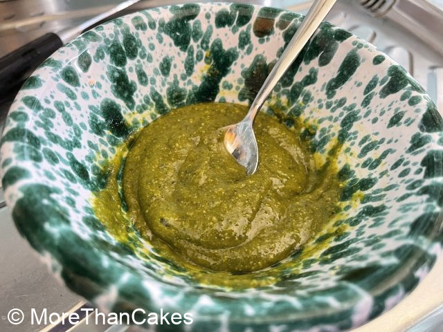 Zerkleinen Sie die Pistazien in einem Zerkleiner. Fügen Sie den Puderzucker dazu und mischen Sie weiter. Geben Sie das Wasser dazu. Die Paste ist fertig.