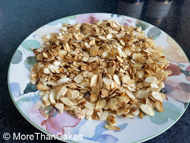 Für das Krokant die Mandelblättchen auf einem Backblech bei 120 Grad im Backofen rösten, dabei ab und zu wenden. Zucker und Puderzucker in einem Topf schmelzen lassen. Die Mandeln noch heiß hinzufügen, alles vermischen und die Mischung auf Backpapier geben. Eine zweite Lage Backpapier darauf legen und die Krokantmasse dazwischen mit dem Nudelholz 0,5 cm dick ausrollen. Den Krokant nach dem Abkühlen mit dem Messer grob zerteilen. Beiseite stellen.