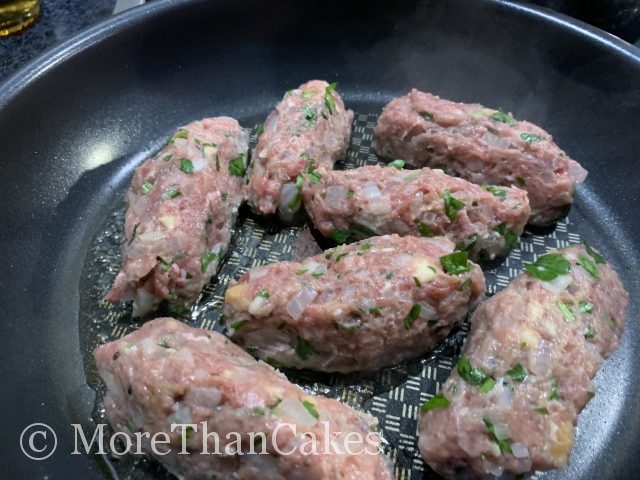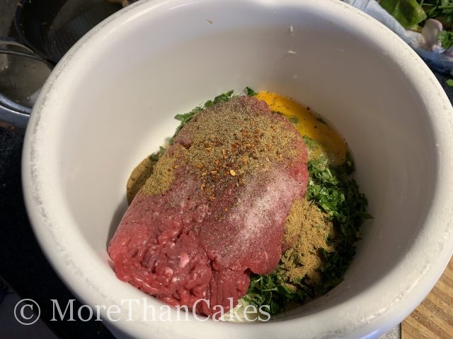 Das Hackfleich für die Köfte in einer großen Schale bereitstellen. Die Zwiebeln schälen, klein hacken und in Olivenöl anschwitzen. Zum Fleisch dazugeben. Das Ei aufschlagen und das Brot in kleine Stücke rupfen und dazu geben. Die Gewürze nach Belieben hinzufügen (später noch abschmecken). Die Petersilie und Knoblauchzehen klein hacken und als letztes hinzufügen. Das Ganze mit einem Schuss Olivenöl bedecken. Nun gut mit den Händen durchmengen. Die Handinnenflächen mit Wasser befeuchten, eine Handvoll Köfte zu einer Rolle rollen und sanft zusammendrücken. Nun in einer Pfanne mit eine wenig Öl knusprig braten.