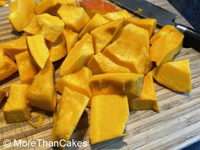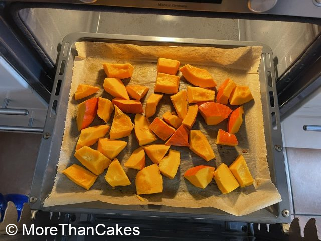Backofen auf 180 Grad (Ober-/Unterhitze) vorheizen. Hokkaidokürbis schälen, entkernen und in Spalten schneiden. Die Kartoffeln 🥔 als Pellkartoffeln aussetzen.