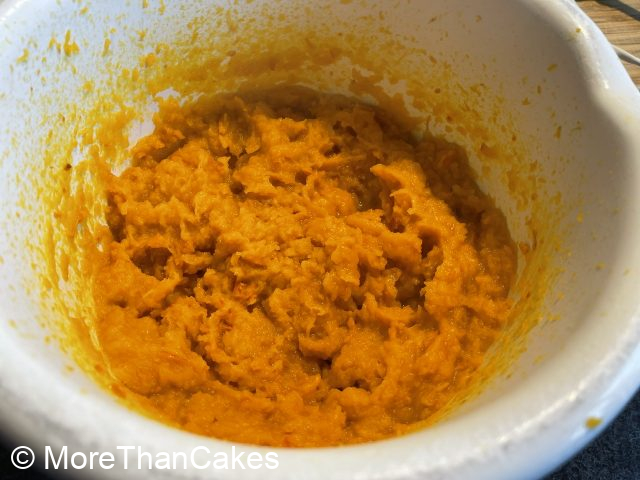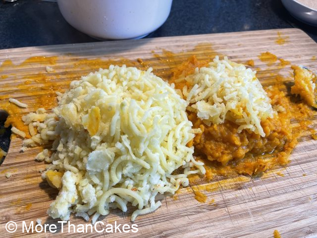 🎃 auf einem mit Backpapier ausgelegten Backblech verteilen und mit Olivenöl beträufeln. Ist der Kürbis schön weich – etwa 45 Minuten -, zusammen mit den geschälten Pellkartoffeln durch eine Presse drücken. Wichtig, das muss warm geschehen, da sonst die 🥔 abbinden. Eigelb, Mehl, Semmelbrösel und Parmesan hinzufügen und zu einem Teig vermengen. Mit Salz, Pfeffer und Muskat abschmecken.