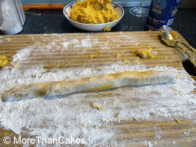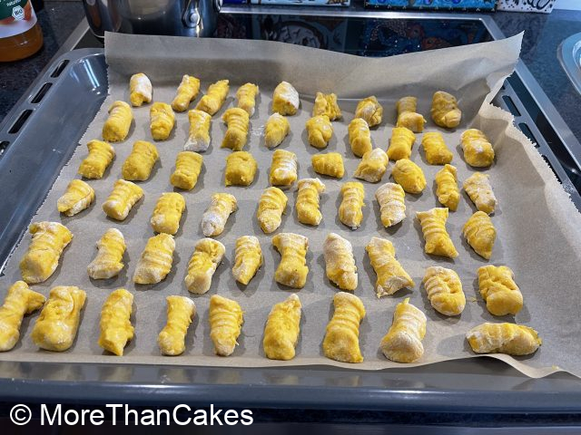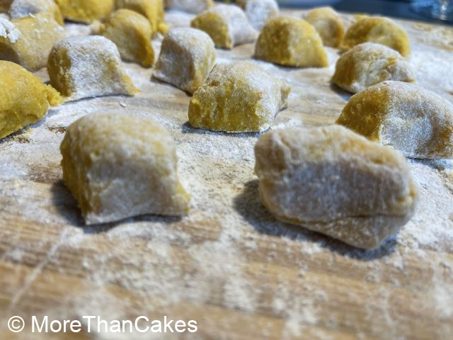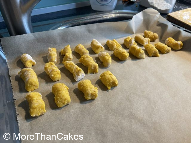 Den Teig auf einer bemehlten Arbeitsplatte durchkneten und zu mehreren, ca. 2 cm dicken Strängen formen. Nun mit einem Messer ungefähr daumendicke Stücke herausschneiden.
