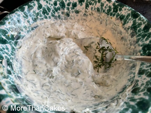 Schmand, Sahne-Meerrettich und Dill in einer Schüssel zu einem Dip verrühren. Mit Salz, Pfeffer und Ras el-Hanout abschmecken. Gurke und Apfel schälen und jeweils in 12 Taler schneiden. Jeden Matjes in 4 Teilen schneiden. Gurkentaler auf einer Platte anrichten, salzen und pfeffern. Apfeltaler und Matjesstücke darauf legen. Ein Klecks Dip darauf verteilen, mit einem Zwiebelring belegen und mit Schnittlauch servieren.