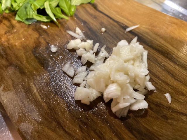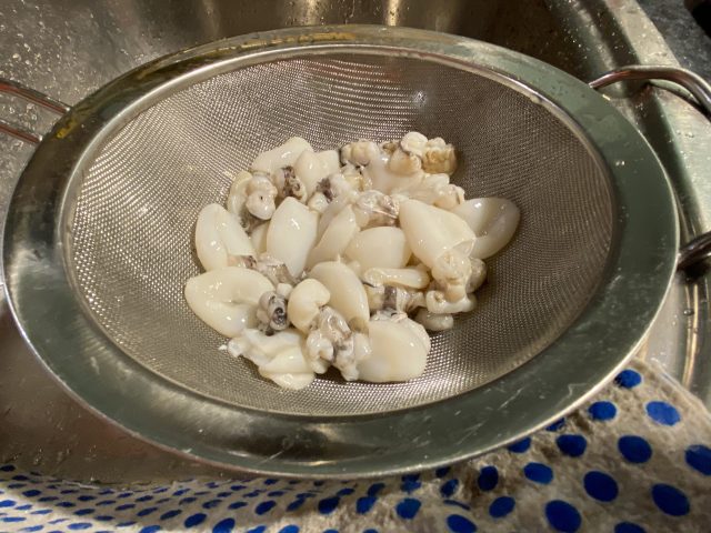 Die Moscardini putzen (ausnehmen, die Augen herausschneiden und den „becco“ (das ist der kleine harte Knorpel an der Mundöffnung des Kraken) herausdrücken. Alles gut waschen und in Stücke schneiden. Wenn die Moscardini noch sehr klein sind, die Tentakel ganz und zusammen lassen, bei größeren Exemplaren sowohl den unteren Teil als auch den Kopf einmal teilen.