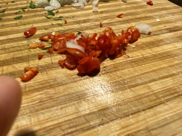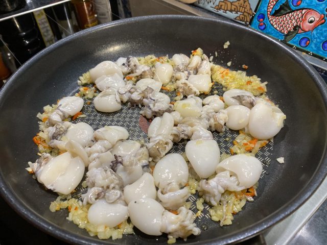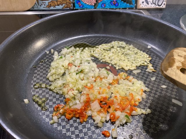 Knoblauch, Zwiebel 🧅, Peperoncini und Petersilie zerkleinern und in etwas Olivenöl leicht andünsten. Die Krakenstücke dazugeben und kräftig mitdünsten. Mit dem Wein ablöschen.