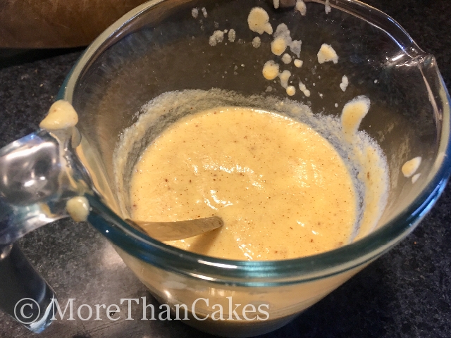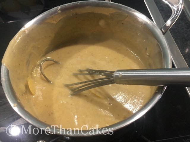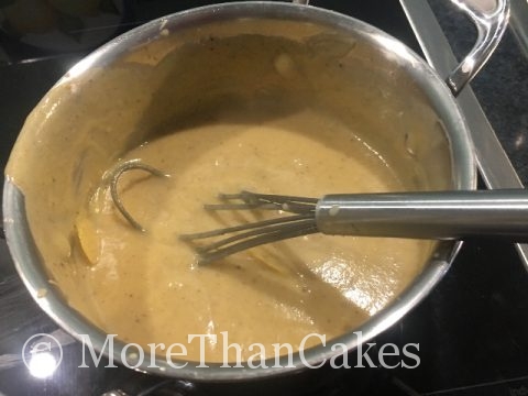Den Sirup wieder erhitzen und langsam die Eigelbmischung hinzugeben und unter ständigem Rühren unter kleiner Flamme 🔥 köcheln lässen, bis eine puddingähnliche Masse entsteht.