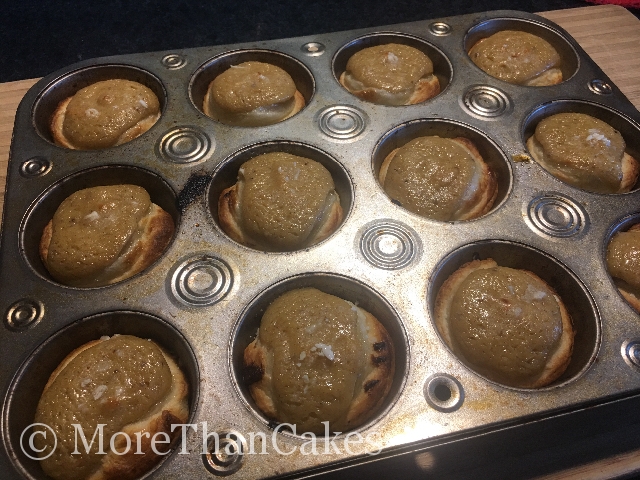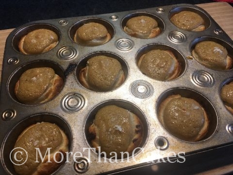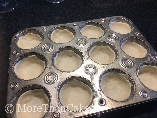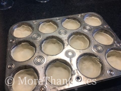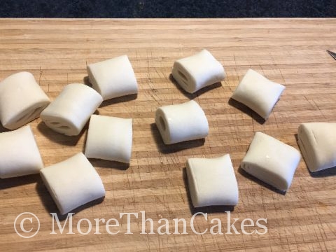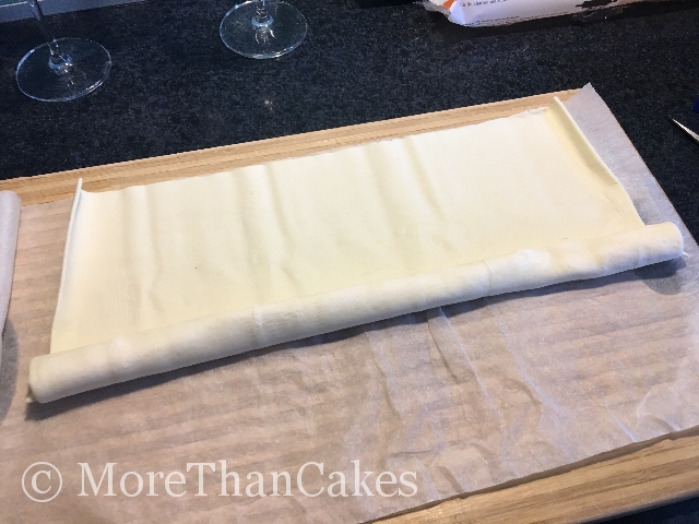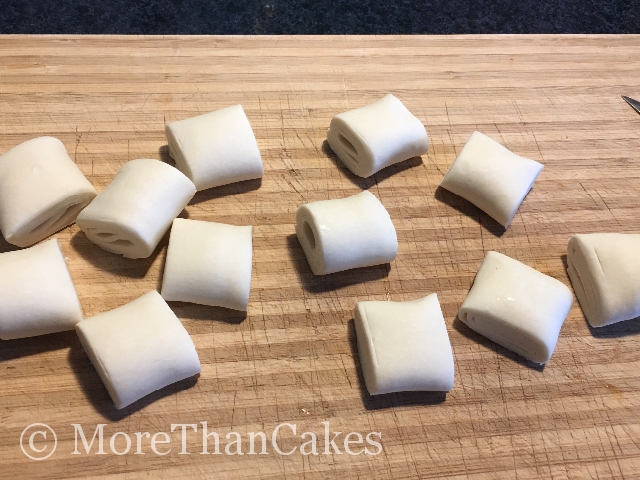 Währenddessen den gekühlten Blätterteig ausrollen und anschließend wieder von der langen Seite wieder locker einrollen. Die Rolle in 12 gleich große Stücke schneiden. Jeweils ein Teigstück mit der Schnittstelle nach unten in die Mulde drücken. Anschließend das Blech noch einmal für ein paar Minuten in den Kühlschrank stellen.
