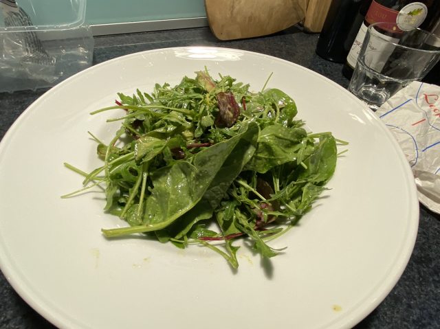 In der Zwischenzeit den Salat in einer Schüssel mit einer Vinaigrette aus Salz, Pfeffer, Olivenöl und Essig verfeinern und auf zwei tiefe Teller verteilen.