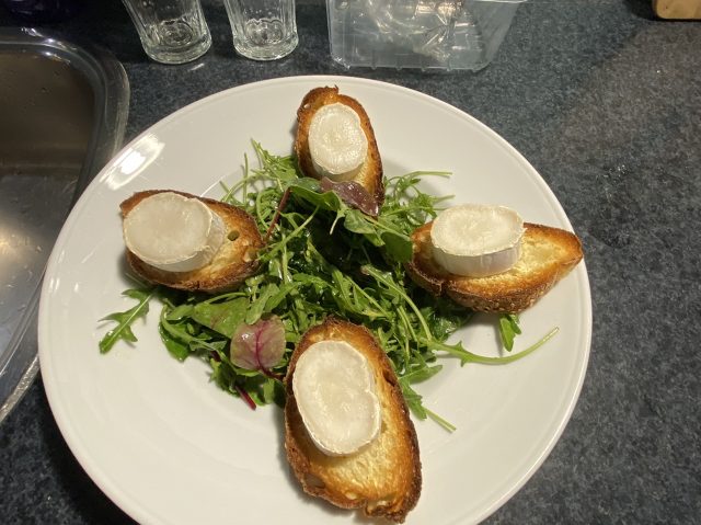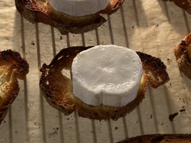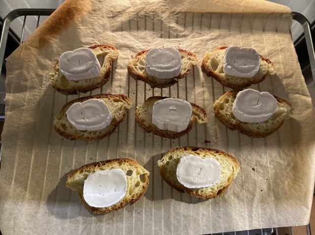 Den Ziegenkäse in 8 Scheiben schneiden. Die Weissbrotscheiben im Backofen auf einer Seite mit der Grillstufe rösten, umdrehen, mit den Ziegenkäsescheiben belegen und solange rösten, bis der Käse etwas verläuft.