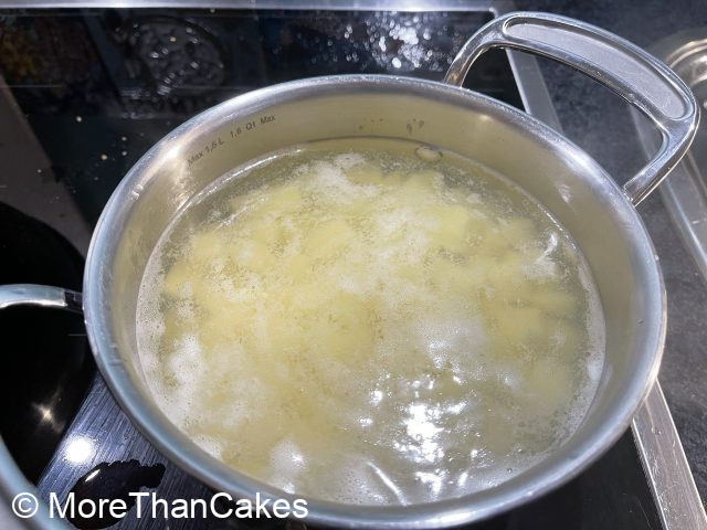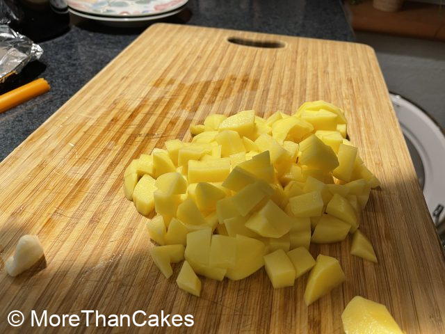 Währenddessen Kartoffeln schälen, in cm Würfel schneiden und kochen. Knoblauchzehen und Petersilie fein hacken.