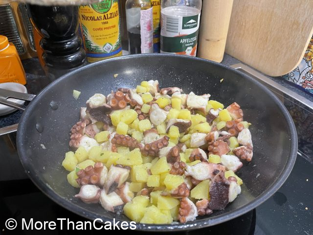 Knoblauch in etwas Olivenöl in der Pfanne anbraten. Gekochte Kartoffeln abgießen und in die Pfanne dazugeben. Octopusstücke und gehackte Ptersilie ebenfalls untermengen. Mit Fischfond, Salz, Pfeffer und Paprika abschmecken. Auf tiefe Teller verteilen und Mit Olivenöl beträufeln.