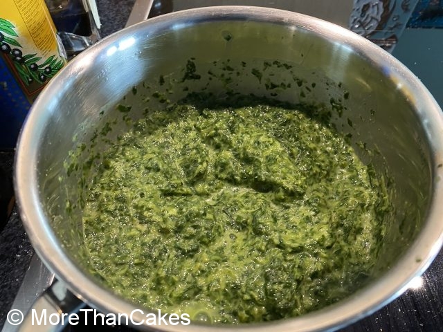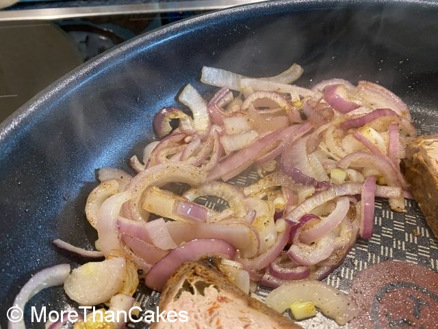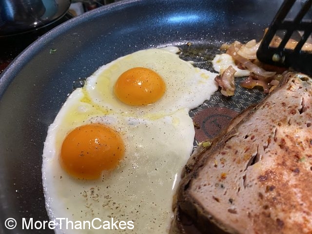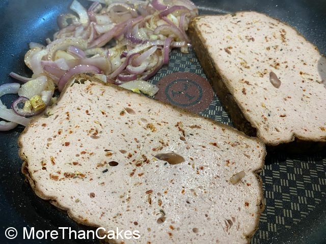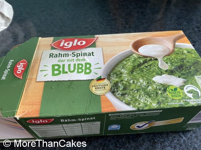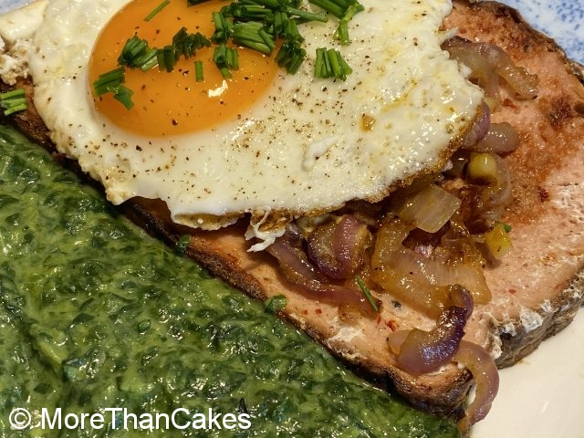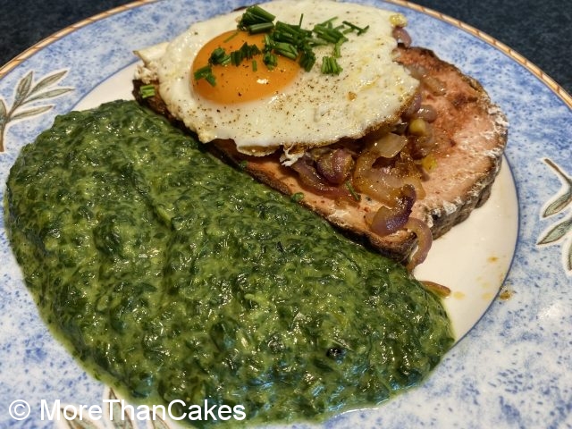 Rahmspinat in einem Topf erhitzen. Mit Muskat, Salz und Pfeffer abschmecken. Zwiebel in halbe Ringe schneiden. Die Ringe mehlieren und in einer großen Pfanne in Butterschmalz andünsten und mit Paprika würzen. Zur Seite schieben. Die Fleischkäse-Scheiben in der gleichen Pfanne in Butterschmalz von beiden Seiten anbraten. Spiegeleier ebenso braten. Servieren.