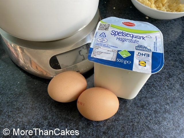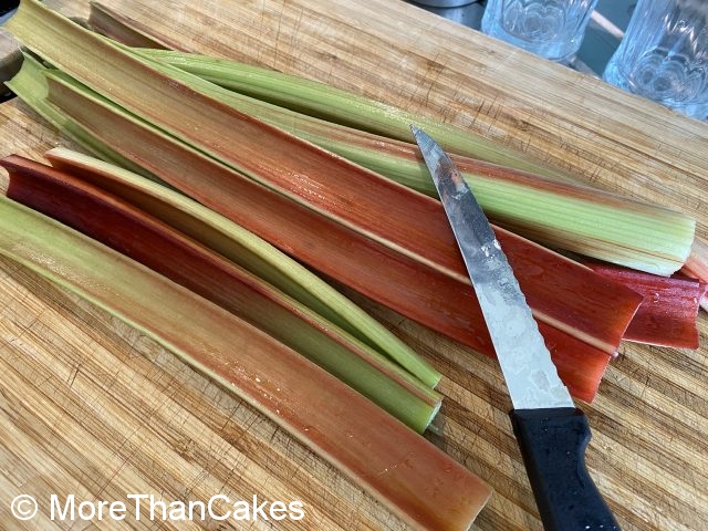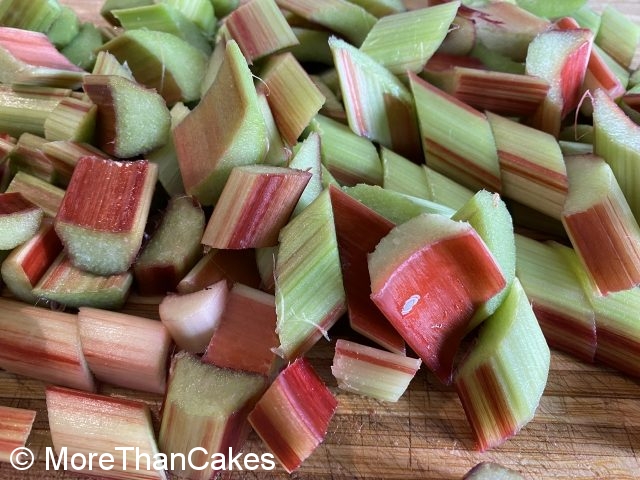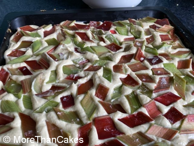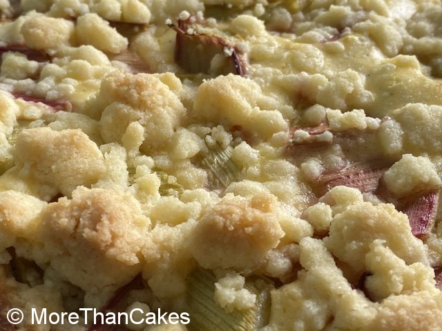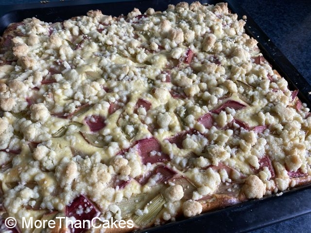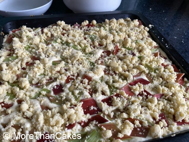 Rhabarber waschen, putzen und in 3 cm große Stücke schneiden. Puderzucker, Vanillezucker und Puddingpulver mischen. Zusammen mit Quark, Eiern und der restlichen flüssigen Butter in eine Schüssel geben und mit den Quirl des Handrührers zu einer glatten Quarkmasse verrühren. Quarkmasse auf dem Mürbeteigboden verteilen. Rhabarber darübergeben. Mit den restlichen Streuseln bestreuen. Im heißen Backofen bei gleicher Hitze ca. 40-45 Minuten backen.