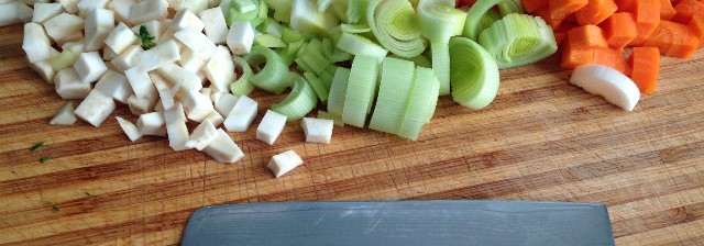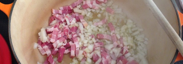 Speck, Suppengrün, Zwiebel, Knoblauchzehen in feine Würfel schneiden. Thymian waschen und abzupfen. In einem großen Topf Olivenöl erhitzen. Speck und Gemüse anbraten. Die Fleischbrühe angießen, Thymian hinzugeben. Zugedeckt bei kleinster Hitze 30 Minuten garen.