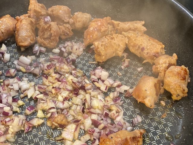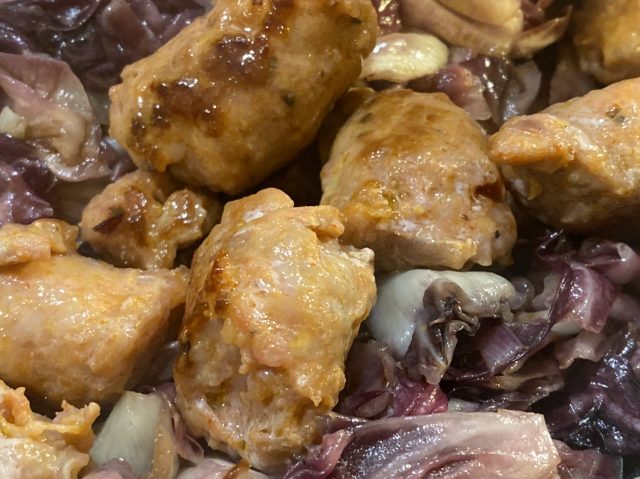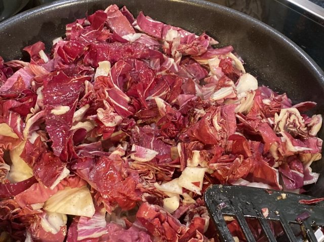 In der Zwischenzeit in einer großen Pfanne die Salsiccia anbraten und herausnehmen. In dem ausgetretenen Wurstfett Radicchio zusammen mit der zweiten Zwiebel und den Knoblauchzehen goldbraun anbraten, salzen und pfeffern.
