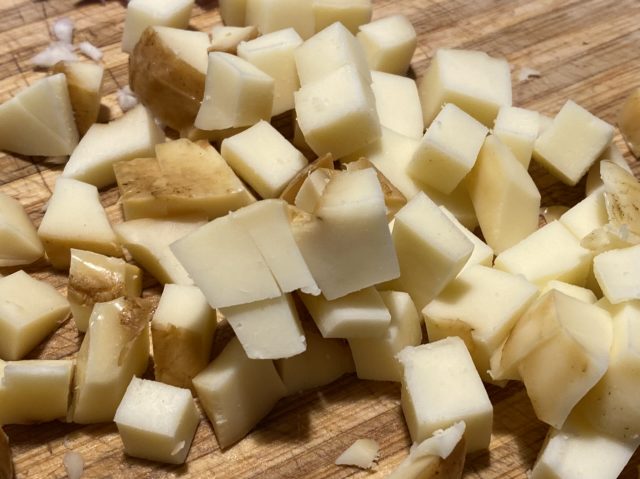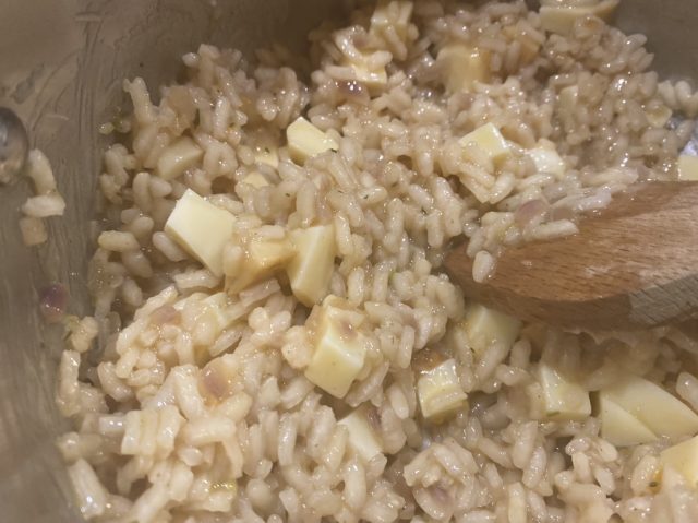 In einem Topf den Reis mit einer Zwiebel goldgelb braten, mit Weißwein ablöschen. Nach und nach die Fleischbrühe angießen, immer wieder einkochen lassen und umrühren. Nach ca. 15-20 Minuten ist der Risottoreis gar (noch bissfest). Scamorza-Würfel dazugeben, gut verrühren, bis der Käse schmilzt.