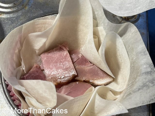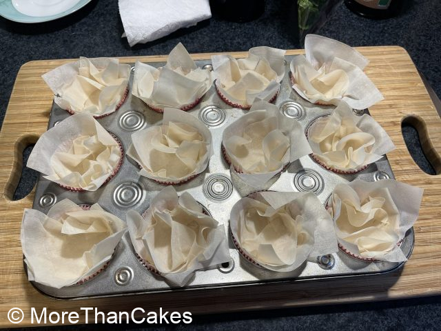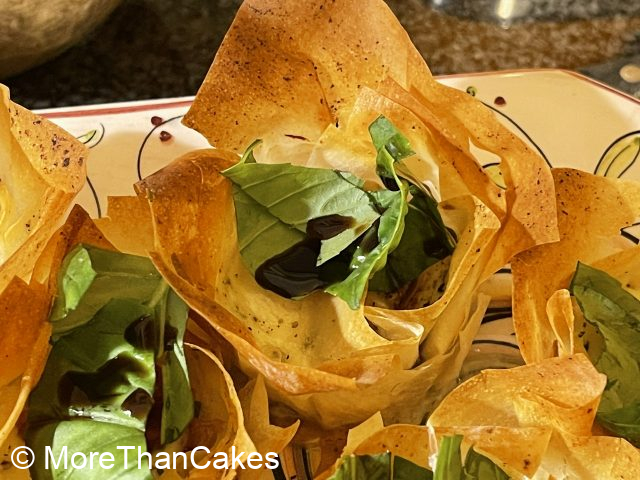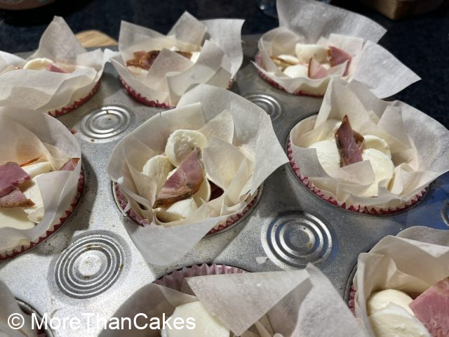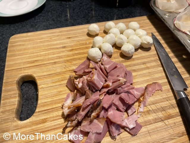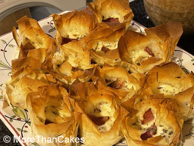 Backofen auf 200 Grad (Ober-/Unterhitze) vorheizen. Mozzarella-Kugeln abtropfen lassen. 3 Filoteigblätter jeweils in 12 gleich große Vierecke schneiden. Drei Teiglagen-Vierecke versetzt aufeinanderlegen und die Muffinmulden damit auskleiden. Mozzarella-Kugel halbieren und mit dem in Flecken geschnittenen Schinken in das Teigkörbchen setzen. Salzen, pfeffern und mit Thymian bestreuen. Teigecken mit etwas brauner Butter bepinseln. Form auf dem Rost in den Backofen auf die 2 Schiene von unten schieben. Backzeit etwa 10 Min.