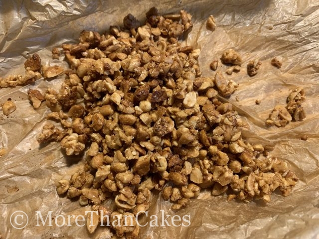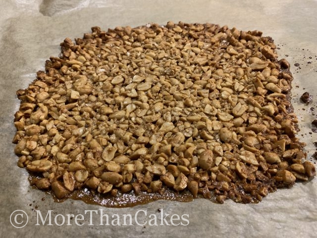 Inzwischen den Ofen auf 180 Grad (Ober-/Unterhitze) vorheizen. Erdnüsse grob hacken. Honig mit 2–3 EL Wasser und Zimt aufkochen, dann mit den gehackten Erdnüssen vermischen. Die Masse auf einem Bogen Backpapier flach verteilen und im Backofen etwa 8–10 Minuten goldbraun karamellisieren. Anschließend abkühlen lassen.