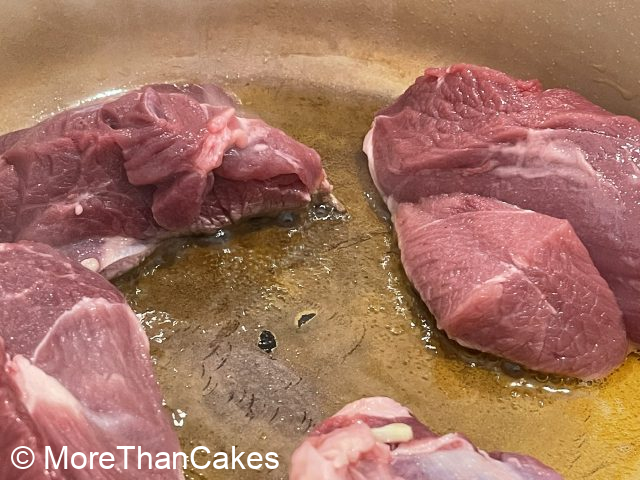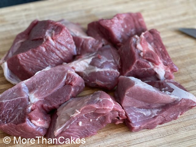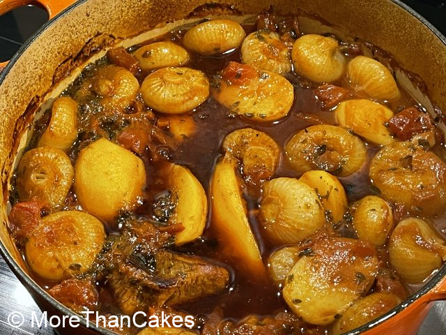 Das Lammfleisch von Fett und Sehnen befreien und in größere Stücke schneiden. Die Größe der Stücke sollten so bemessen werden, dass 2-3 pro Person ausreichend sind. Die Lammstücke werden dann in einem großen Bräter portionsweise in Olivenöl gründlich angebraten, bis sie ringsherum Farbe angenommen haben. Herausnehmen. Anschließend die Perlzwiebeln hinzufügen und etwas anschwitzen lassen.