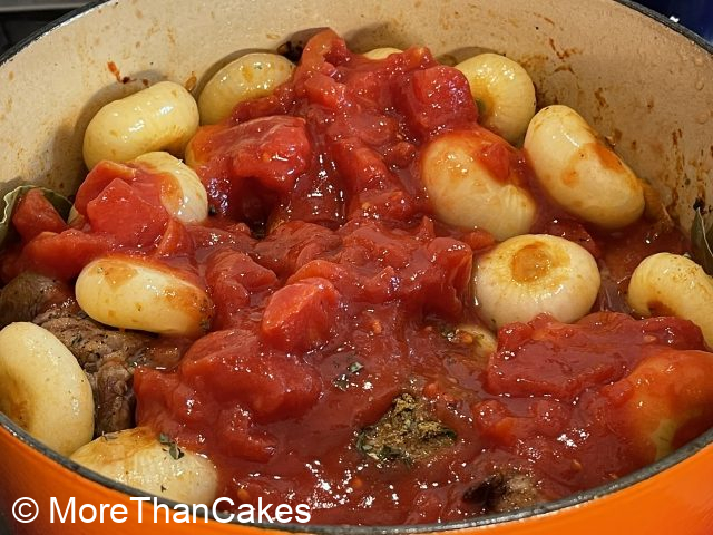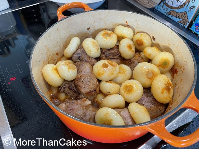 Anschließend wird das Stifado mit heißem Wasser aufgefüllt, bis das Fleisch fast vollständig bedeckt ist. Deckel aufsetzen und den Topf für 2 Stunden in den 160 Grad heißen Backofen (Ober-/Unterhitze) stellen.