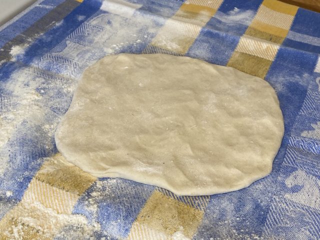 Mehl, Öl, Salz und Wasser in die Rührschüssel der KitchenAid geben und mit dem Knethaken auf zuerst Stufe 2 und dann Stufe 4 zu einem glatten Teig kneten. Den zu einer Kugel geformten Teig in Folie einwickeln und mindestens 30 Minuten bei Zimmertemperatur ruhen lassen.