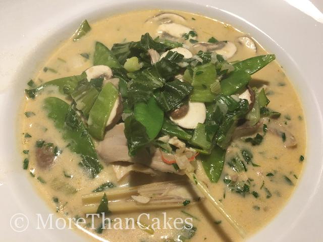 Zutaten für 8 Personen: 2 Hähnchenbrüste am Knochen mit Haut 1 Ananas 1 rote Chilischote 3 Stangen Zitronengras 4 Schalotten 30 g Ingwer 200 g Zuckerschoten 20 Kirschtomaten 3 EL Currypaste 12 Kaffirlimettenblätter 1...