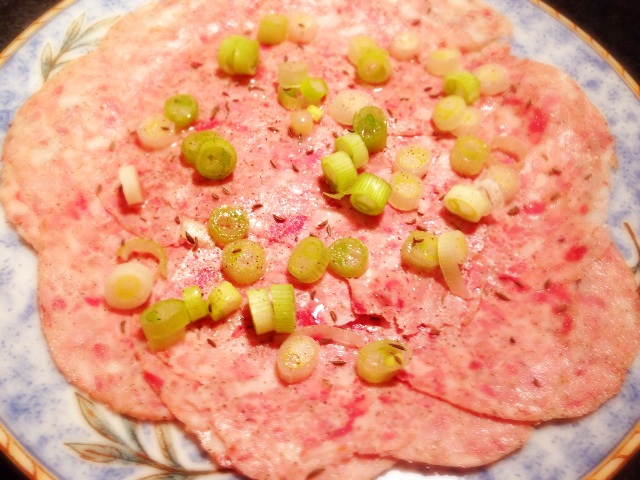 Zutaten für 2 Personen: 16 dünn mit der Aufschnittmaschine geschnittene Presskopfscheiben Weißer Balsamicoessig Olivenöl 1/2 Bund Frühlingszwiebel Etwas Kümmel Zubereitung: So einfach, schnell und lecker! Den Presskopf auf einem Teller anrichten, mit weissen Balsamico...