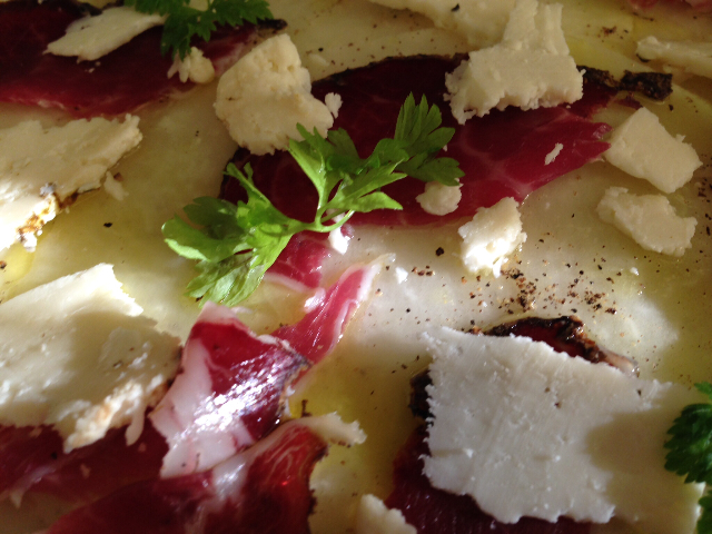 Zutaten für 4 Portionen: 1 Kohlrabi 50 g Schinken (Parma oder Serrano oder … hauptsache dünn …) 50 g Parmesan oder Pecorino am Stück Saft einer Zitrone Pfeffer Salz Olivenöl einige Blätter Kerbel Zubereitung:...