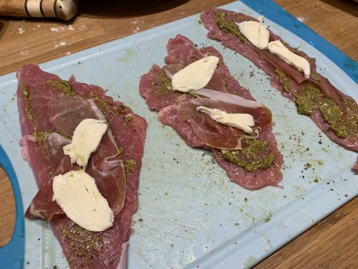 Zutaten für eine Kastenform 20 cm: 100 g Serranoschinken in hauch- dünnen Scheiben 600 g Büffelmozzarella 150 g getrocknete Tomaten 6 Tl grünes Pesto Zubereitung: Due Kastenform mit Frischhaltefolie auslegen. Mit Schinkenscheiben (bis auf...