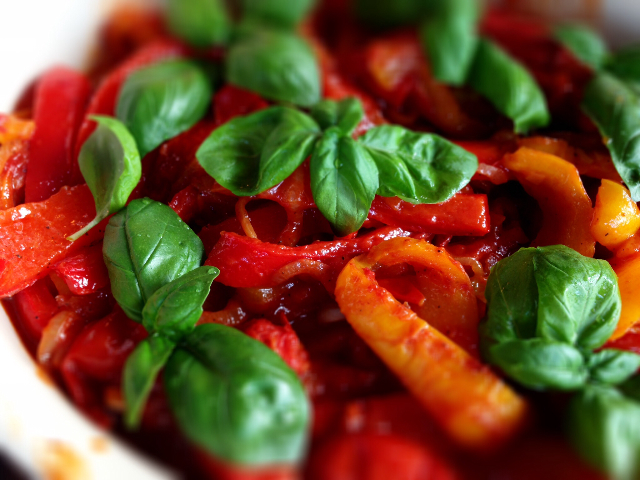 Zutaten für 4 Portionen: 3 große Paprikaschoten (rot oder gelb) 1 Dose gehackte Tomaten (400 g) 2 Zwiebeln 5 Knoblauchzehen 4 El Weißweinessig Olivenöl Salz Pfeffer Zucker Chiliflocken oder Chilischote Basilikum Zubereitung: Paprikaschoten halbieren,...