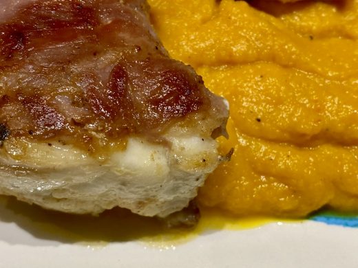 Zutaten für 2 Personen: 6 Seeteufelmedaillons (je 60 g, aus dem dicken Mittelstück; küchenfertig gehäutet) 6 Scheiben Parmaschinken Fischgewürz Olivenöl Salz 🧂 Pfeffer 1/2 Hokkaido-Kürbis 1 Zwiebel 🧅 1/2 Chili 🌶 Saft einer 1/2...